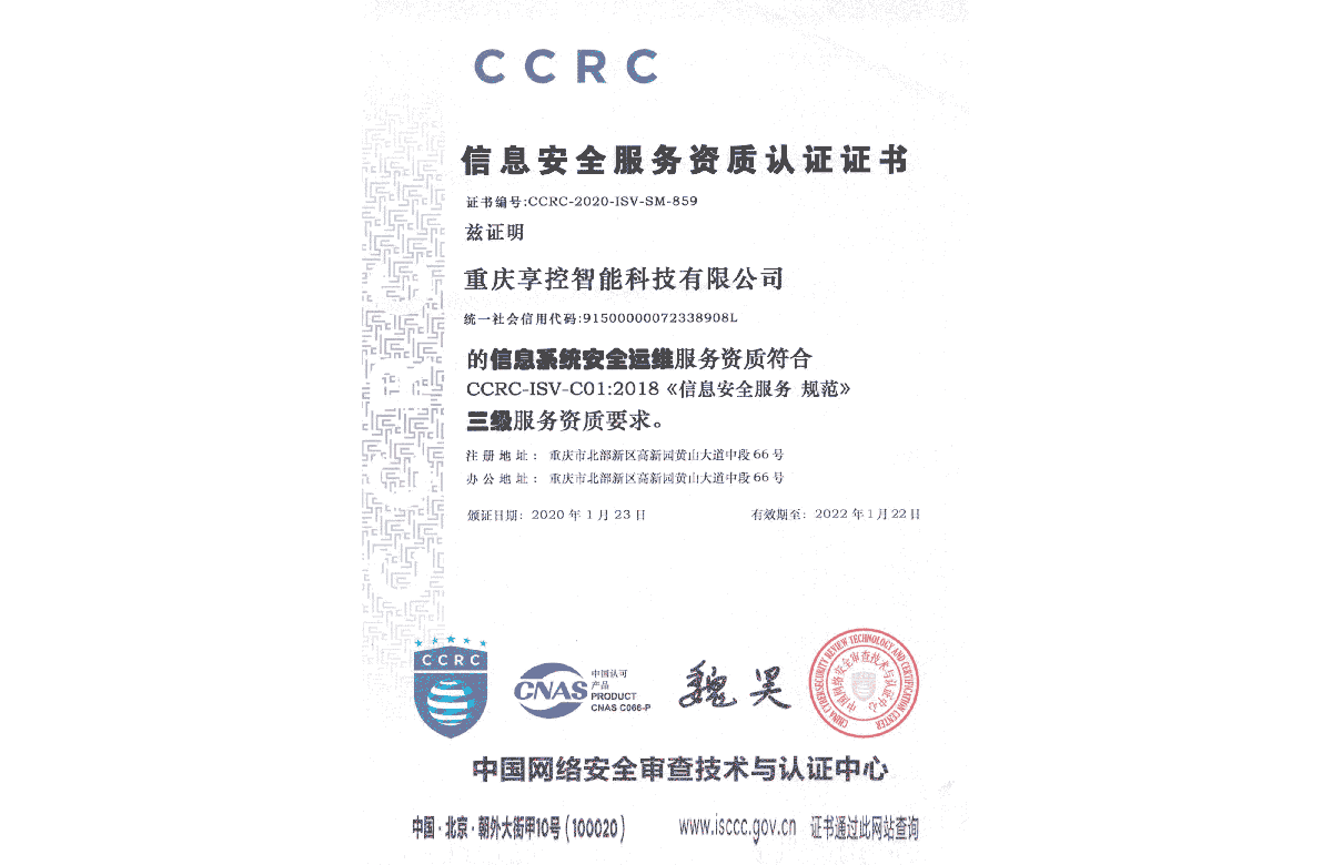 獲信息安全服務體系認證證書